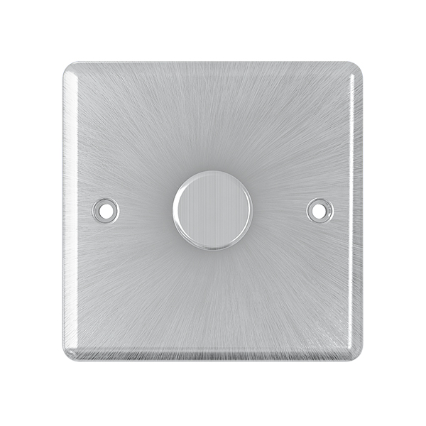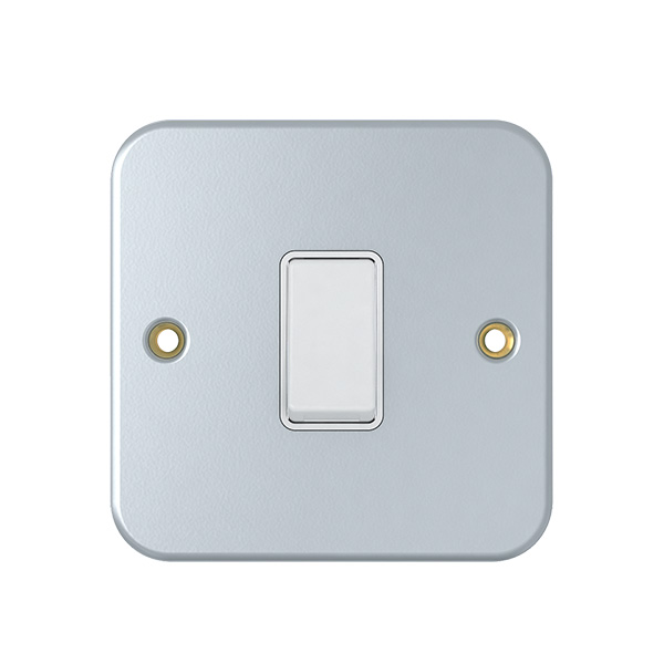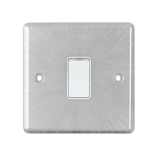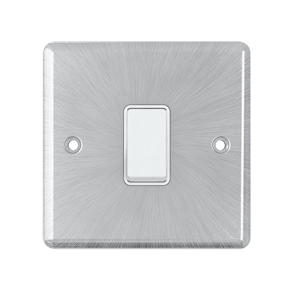 1 Gang 1 Way 10 Amp Switch X-Rated for fluorescent or inductive loads White Insert and white Plastic Rocker Material : Premium Grade Steel Finishing: Satin Chrome with Lacquer coating voltage: 220-250V, 50/60Hz Dimensions: 86 x 86x 9 mm (Plate) Warranty 15 Years Compliant with BS 60669-1