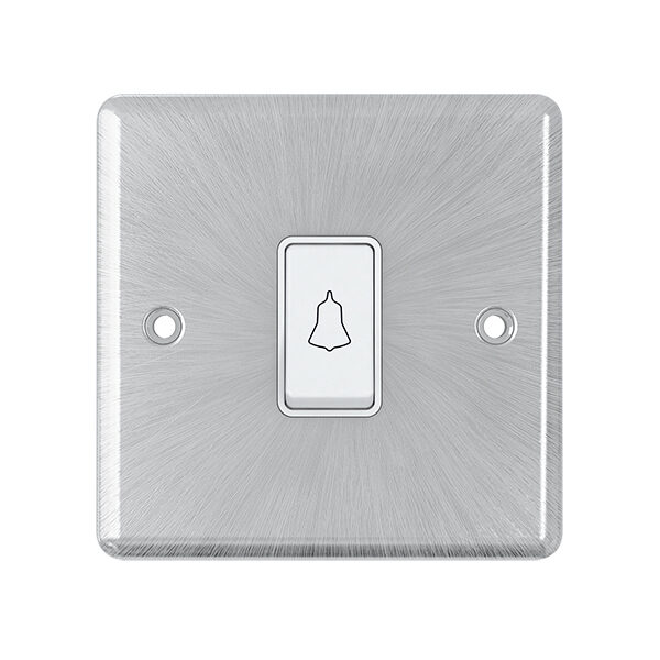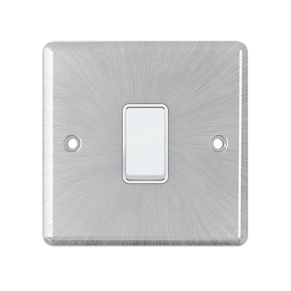 1 Gang 1 Way 10 Amp Switch X-Rated for fluorescent or inductive loads White Insert and white Plastic Rocker Material : Premium Grade Steel Finishing: Satin Chrome with Lacquer coating voltage: 220-250V, 50/60Hz Dimensions: 86 x 86x 9 mm (Plate) Warranty 15 Years Compliant with BS 60669-1