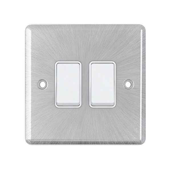 2 Gang 2 Way 10 Amp Switch X-Rated for fluorescent or inductive loads White Insert and white Plastic Rocker Material : Premium Grade Steel Finishing: Satin Chrome with Lacquer coating voltage: 220-250V, 50/60Hz Dimensions: 86 x 86x 9 mm (Plate) Warranty 15 Years Compliant with BS 60669-1