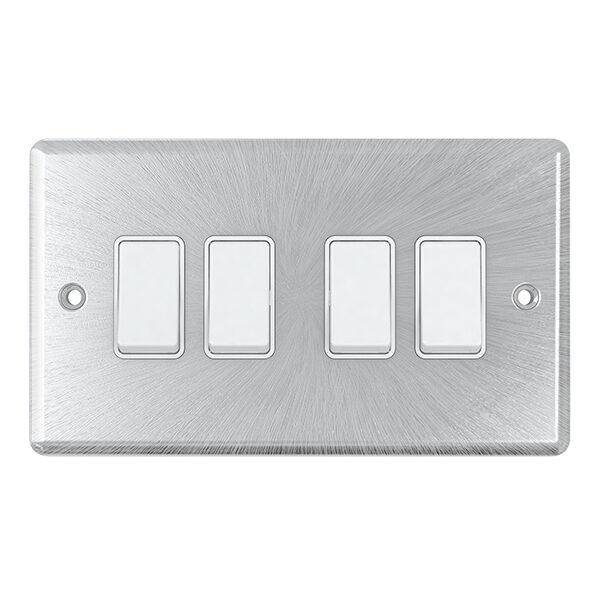 4 Gang 2 Way 10 Amp Switch X-Rated for fluorescent or inductive loads White Insert and white Plastic Rocker Material : Premium Grade Steel Finishing: Satin Chrome with Lacquer coating voltage: 220-250V, 50/60Hz Dimensions: 86 x 146x 9 mm (Plate) Warranty 15 Years Compliant with BS 60669-1