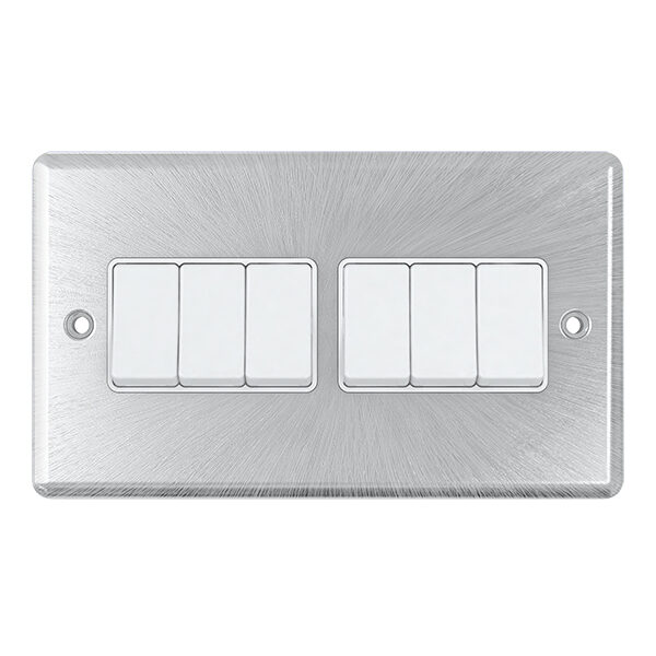 6 Gang 2 Way 10 Amp Switch X-Rated for fluorescent or inductive loads White Insert and white Plastic Rocker Material : Premium Grade Steel Finishing: Satin Chrome with Lacquer coating voltage: 220-250V, 50/60Hz Dimensions: 86 x 146x 9 mm (Plate) Warranty 15 Years Compliant with BS 60669-1